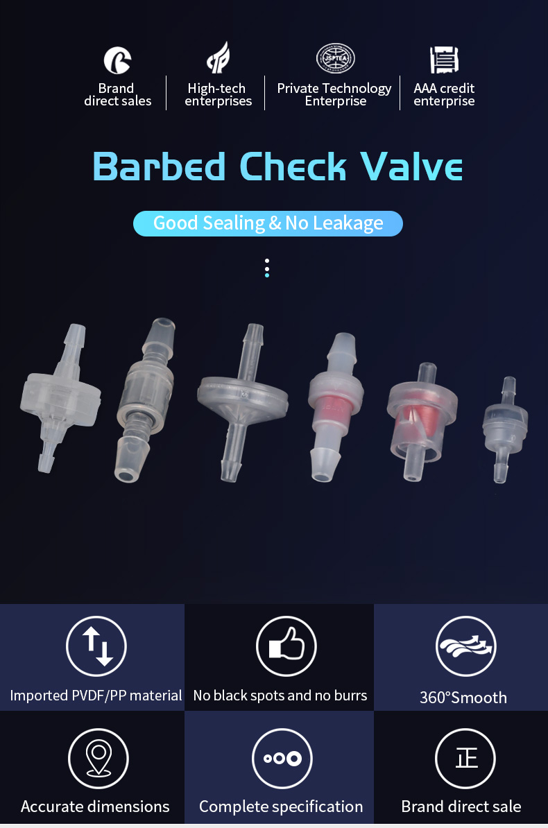 Barbed Check Valves are designed for connecting flexible peristaltic tubing in low pressure systems less than 0.3Mpa to control the flow directions to make fluids flowing in one specific direction, so it makes fluids inlet-only or outlet-only to pumps or valves.
