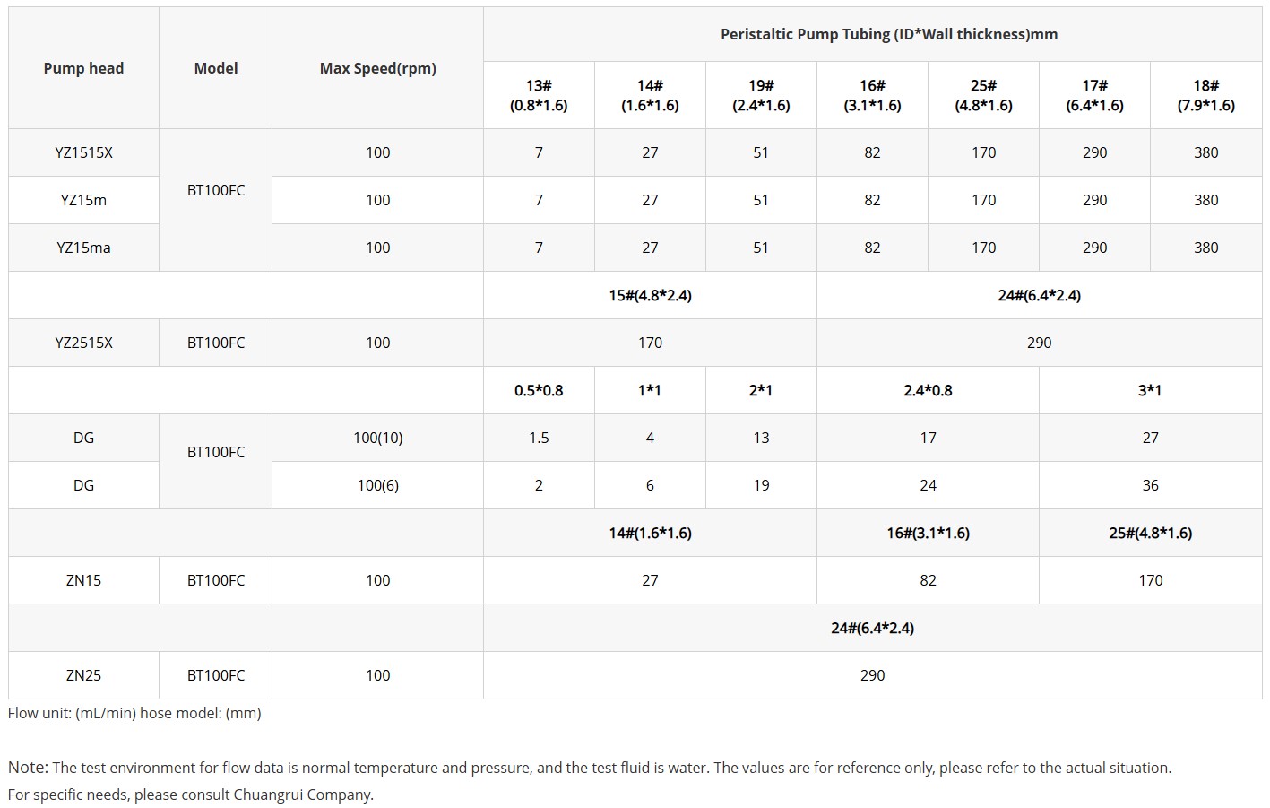The flow rate of BT100FC dispensing peristaltic pump is from 0.0015 to 480mL/min.