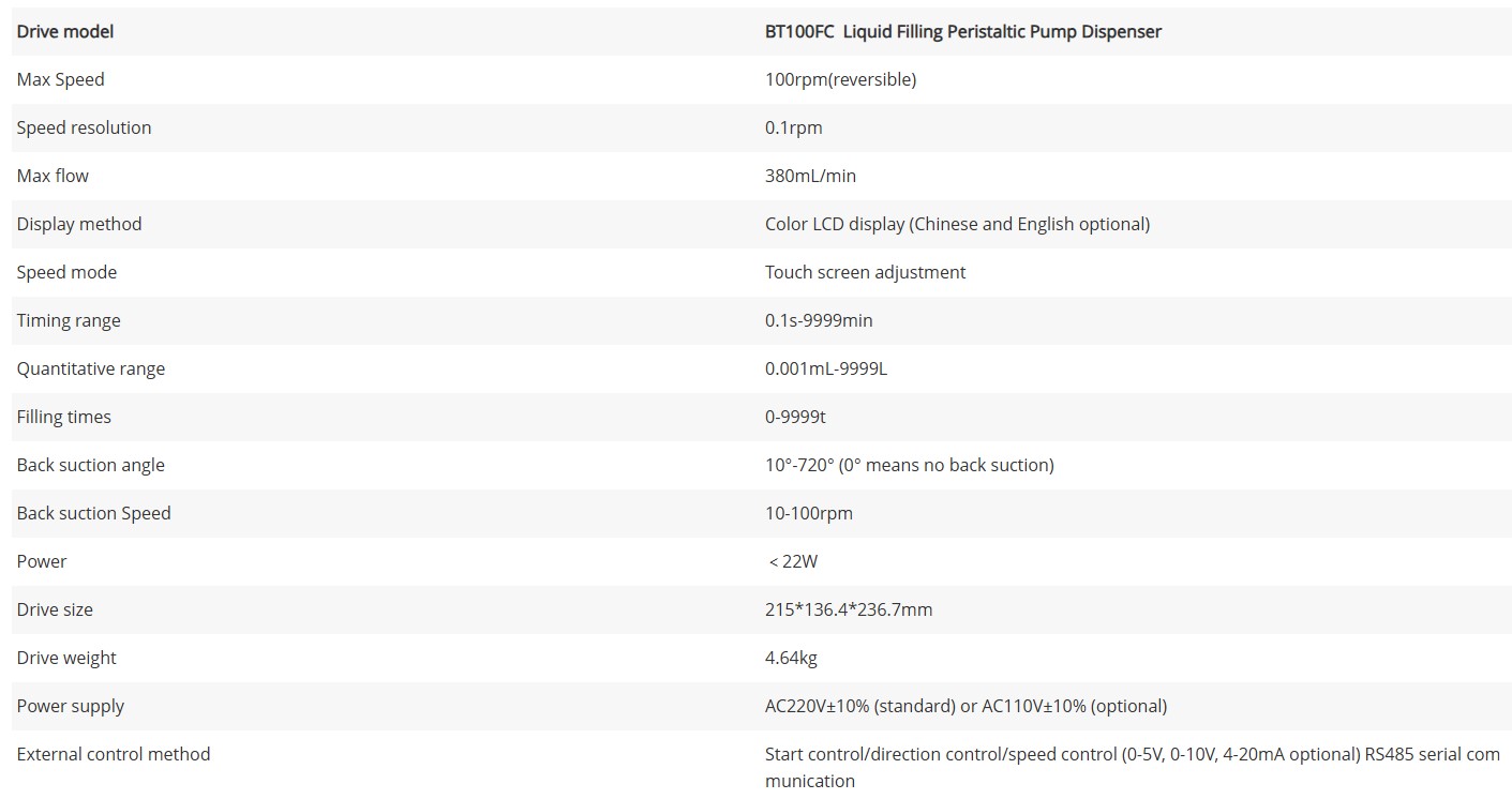- The BT100FC peristaltic pump dispenser is used for precision liquid filling. Accuracy liquid volume filling.