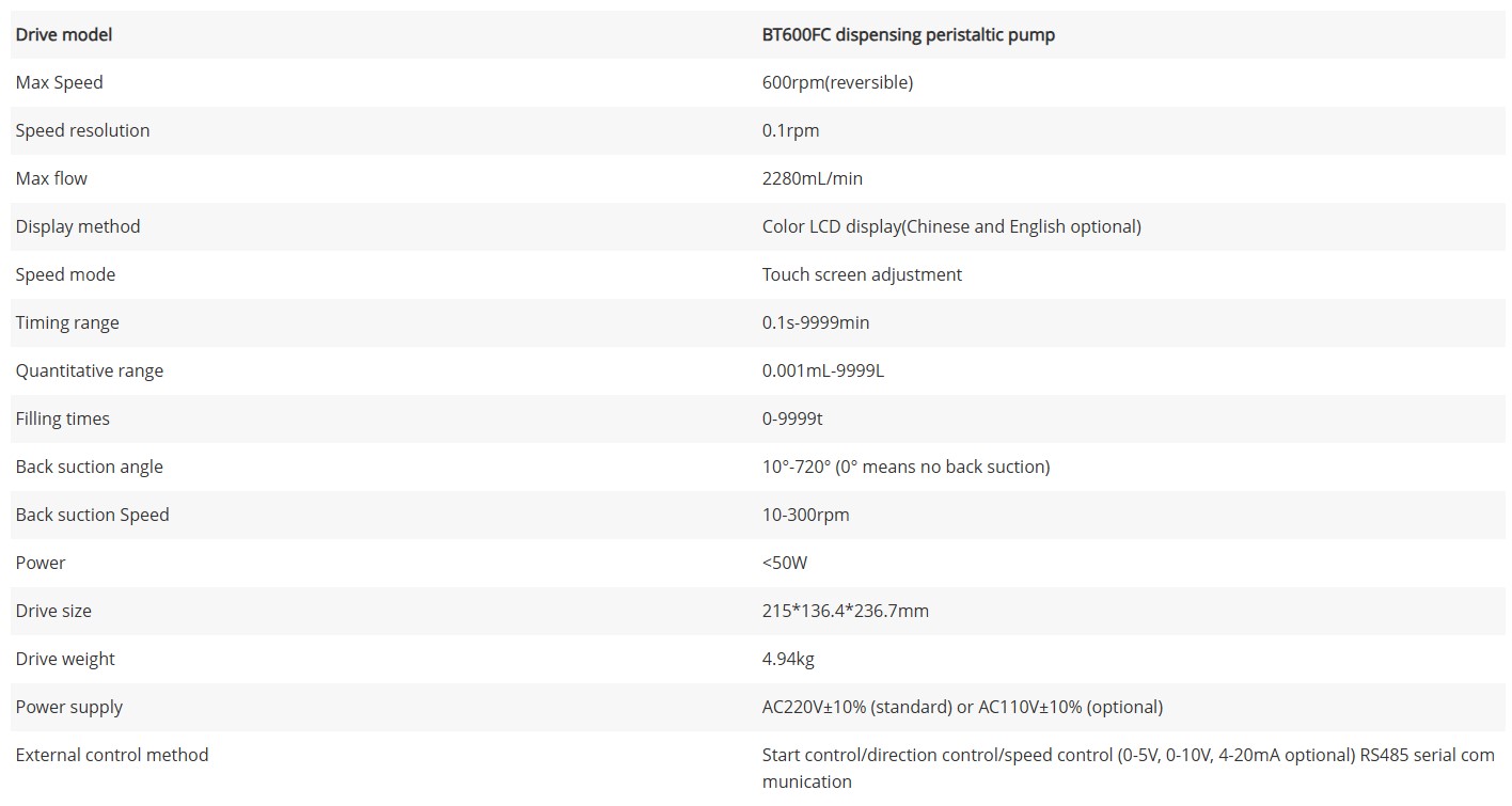 It can store 8 sets of filling data, realizing fast filling. The BT600FC peristaltic dosing pumping provides manual,