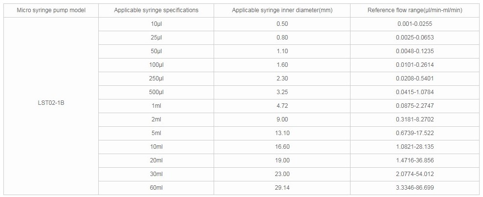Linear speed range: 5μm/min-130mm/min (flow rate = linear speed × cross-sectional area inside the syringe)