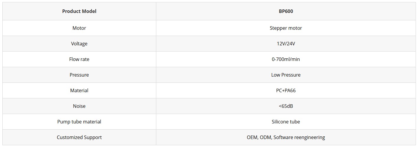 BP600 mini peristaltic pump is compact in size and has large power. The flow rate is 700ml/min. Peristaltic metering pumps are used for laboratory and chemical transfer. 12v and 24v peristaltic pump for optional at a cheap price.