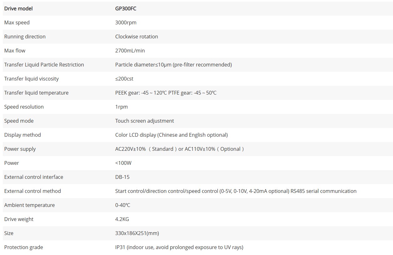 GP3000FC is a micro gear pump. The flow rate range is from 90 to 2700mL/min. It is mainly used for Laboratory research for precise fluid transfer. GP3000FC adopts a 3.5-inch color LCD touchscreen display and a unique magnetic coupling design, which can accurately handle fluids without leakage/pollution/pulsation. It has two working modes of transmission and distribution. This micro gear pump achieves constant transferring fluid without pulsation and low noise.