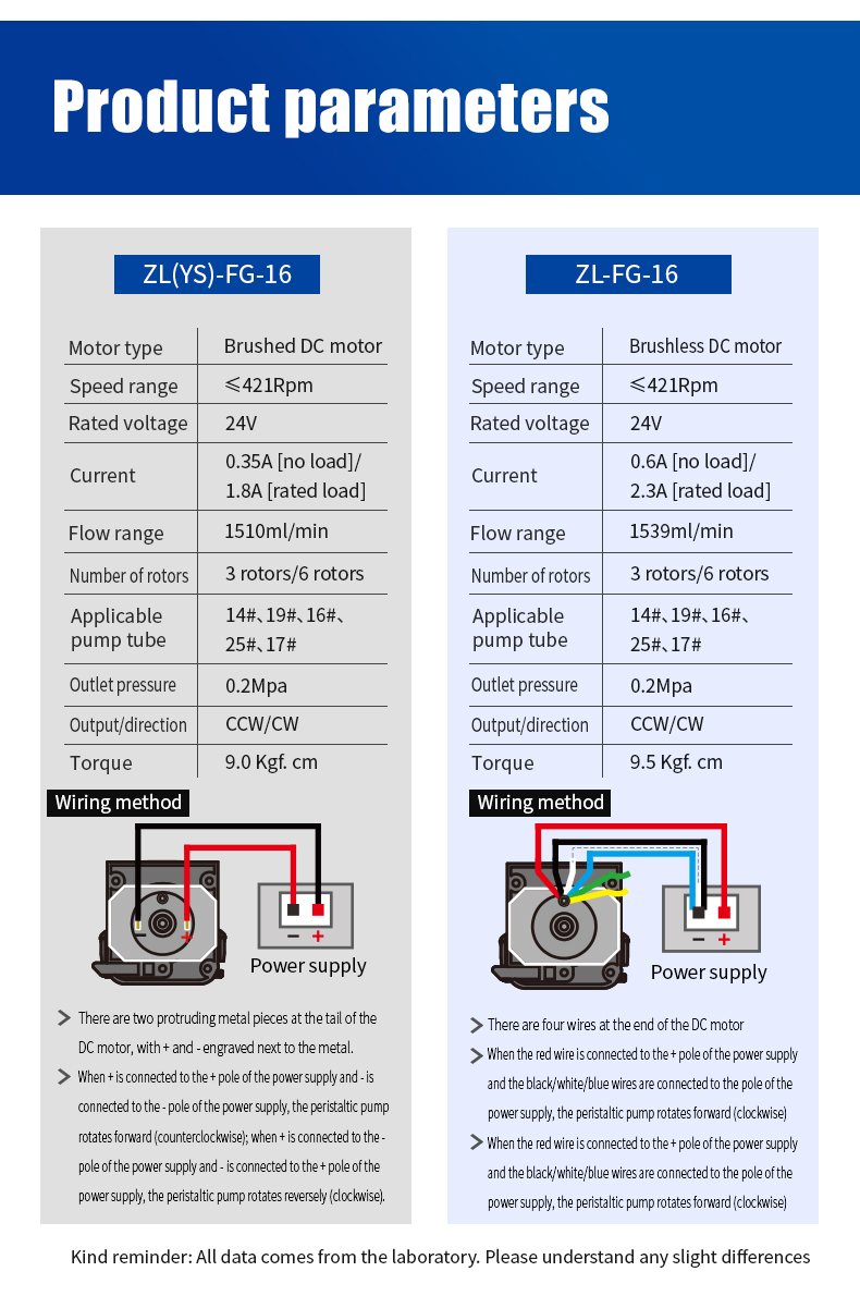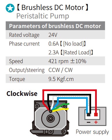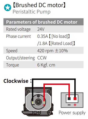 - When the "+" is connected to the positive terminal of the power supply and the "-" is connected to the negative terminal, the peristaltic pump rotates forward (counterclockwise). When the "+" is connected to the negative terminal of the power supply and the "-" is connected to the positive terminal, the peristaltic pump rotates in reverse (clockwise).