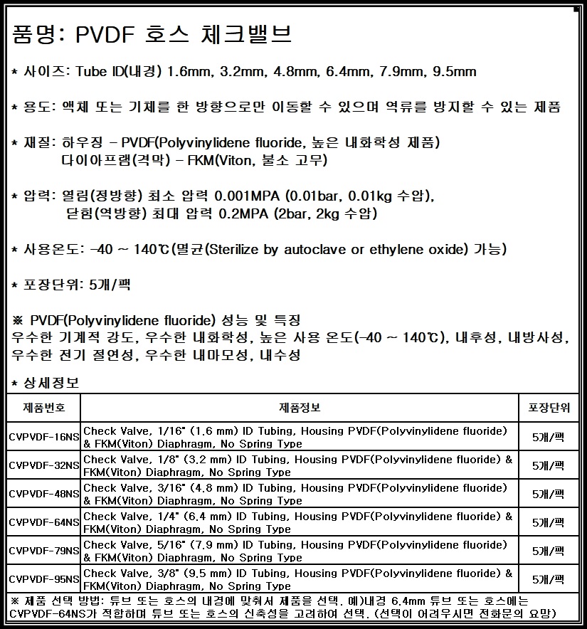 튜브 호스 PVDF 체크밸브 기체 액체 역류 방지 [내화학성 check valve]