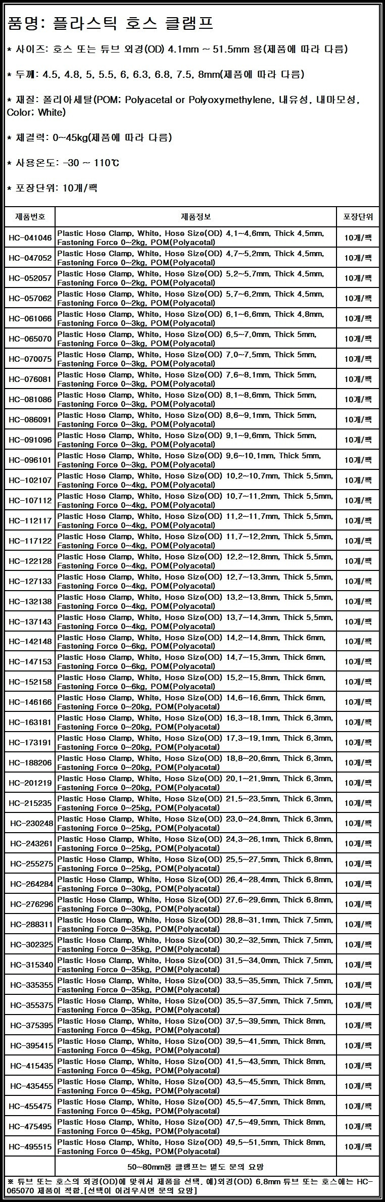 튜브 호스 클램프 기체 액체 차단 PP