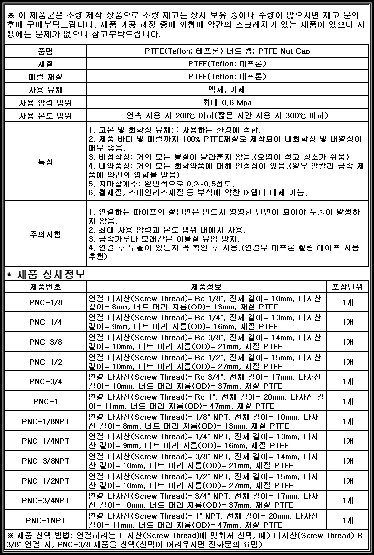 [Fitting] PTFE 테프론 너트 캡 PT NPT 플러그 클로저 마개 뚜껑 plug 마감 teflon 암나사캡 암나사탭 Female cap closure